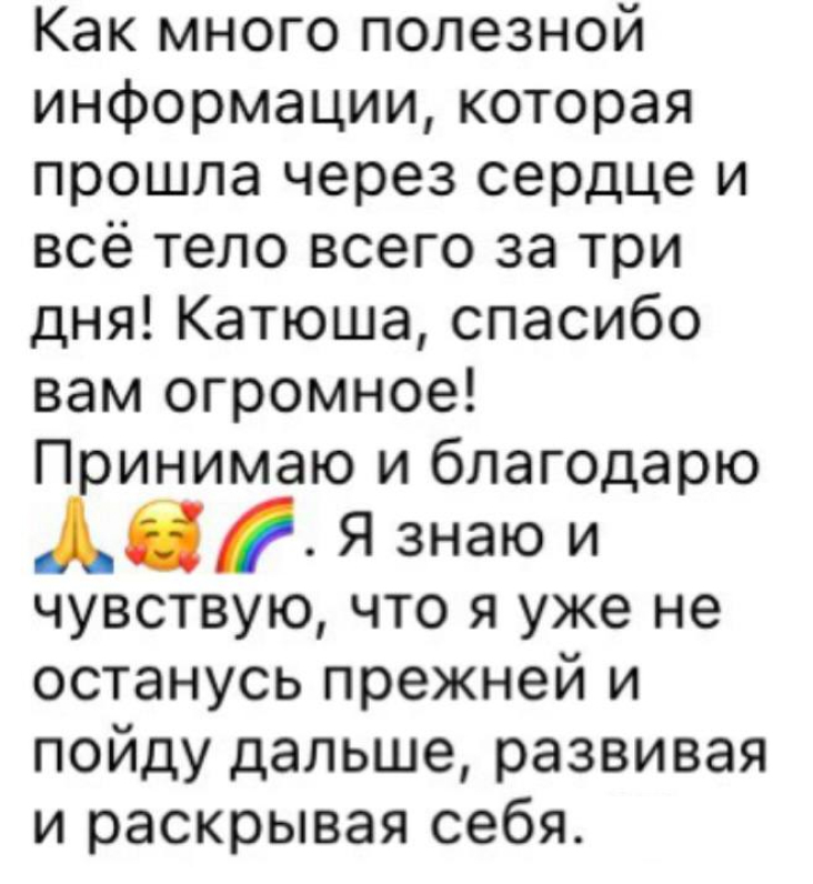 Ты сможешь вернуться к эфирам, пересмотреть их, выписать понравившиеся практики, найти причины того, что происходит в твоей жизни и понять, как это изменить, улучшить.